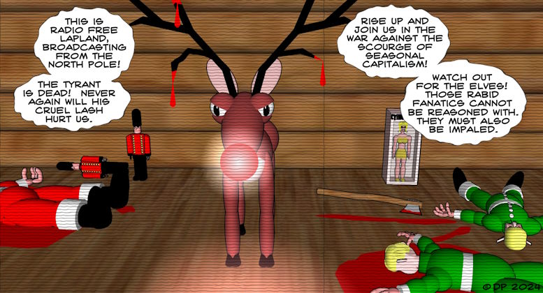 DEATH COMES TO THE NORTH POLE FADE IN INT. ENTRY HALL - DAY At one end, the outside world, a snowy landscape. A whistling, cold wind blows. At the other end, a store room containing a big sled, loaded with bulky sacks. Hanging from wall hooks are a dozen leather harnesses. An ELF comes running inside, clearly terrified, clearly being chased by something. He stumbles and staggers. LOUD HOOFBEATS. SNORTING. A HUGE SHADOW blots out the light from the outside world. The Elf spins round to face what's coming, he opens his mouth to SCREAM-- Cut away from the doomed Elf, RED BLOOD spatters the hall as SWISHING, SLASHING SOUNDS, as if from multiple blades, play over the Elf's YELPS. INT. STUDY - DAY The BIG JOLLY BEARDED MAN whose name must not be spoken aloud lest he adds you to his naughty list, sits at his desk, which is piled with yellow scrolls. He dips a feather quill into an ink pot and writes on one of the scrolls. BIG JOLLY BEARDED MAN Refused to help his mother with chores... called his little sister names... Oh, dear. Definitely a lump of coal for you, you little shit. Something, perhaps a noise, makes the Big Man stop writing and turn to look at the door. Just at that moment the door opens and another Elf bows from the waist. His name is BOB. BIG JOLLY BEARDED MAN I told you I was not to be-- BOB My lord! There's something happening out there! One should perhaps pause for a moment to describe Bob. He has a pale complexion and has pointy ears and big blue eyes and a pointy nose. He wears a green cap, a green jacket with silver buttons, and green pants tucked into shiny black boots. All Elves look like this. BIG JOLLY BEARDED MAN If you could be more specific...? BOB Merry and Bright went outside to round up the herd. That was over an hour ago. I sent Roundbutt to see what was holding things up. The Big Man sets his quill down and stands up. He towers over Bob, a giant of a man to the smaller Elf. BIG JOLLY BEARDED MAN Spare me your exposition. Show me what is amiss. Bob nods and turns and runs off. The Big Man ducks his head through the doorway and lumbers after him. INT. LONG HALLWAY - DAY Bob scoots by. Behind him comes the Big Man, each of his long strides three times the length of Bob's. This place is built for smaller people, the Big Man has to duck constantly to avoid banging his noggin on joists and arches. There are doors along either side of the long hallway and through them we catch glimpses of clanking assembly lines, sacks are filled with toys and electronic gadgets. ELVES manning the machines look round as the Big Man passes by. Bob leads the Big Man to a doorway at the end of the long hallway. He stops there and beckons for the Big Man to stop. Bob peeks through the doorway and pulls back instantly. The Big Man, who is hunched over below the low ceiling, turns his head and listens. HOOFBEATS. SNORTING. INT. MIDDLE ROOM - DAY Looking back through the doorway, beyond which the Big Man and the Elf lurk. In this room there are many large shapes moving around, we only see their shadows, cast large upon the walls and through the doorway. More LOUD HOOFBEATS and SNORTING. UNSEEN ELF (O.S.) No, please, haven't I always been kind to you, haven't I brought you nice lichen? The SNORTING becomes angrier, if you can imagine such a thing. The unseen elf SCREAMS. And the walls are suddenly painted with blood spatter. The Big Man and Bob look at each other, horrified. INT. LONG HALLWAY - DAY The Big Man notices a big axe hanging on the wall, with a sign underneath that reads: IN CASE OF FIRE YELL LOUDLY AND CHOP YOUR WAY OUT The Big Man's huge hands reach for the big axe. INT. MIDDLE ROOM - DAY The Big Man pushes himself through the doorway, hiding the axe behind his back. The HOOFBEATS and SNORTING die away. Abrupt silence. The Big Man finds himself staring at several REINDEER. They stand in the bloody remains of the Elf who had pleaded for mercy, but received only a terrible death. Their antlers are like huge scythes, dripping gore. One of the reindeer pushes forward through the others. He has a mutant defect, his nose radiates a pulsating red light. Alas there is no room here for his tragic backstory involving his mother giving birth in the glowing ruins of an abandoned Russian nuclear facility, then sacrificing her own life to distract the hunters so her child could survive. But it also gave him the power of human speech. BIG JOLLY BEARDED MAN I should have guessed it was you. I took you in and gave you shelter, a place to live, when others treated you as an outcast. In return you have betrayed me. And have murdered my faithful Elves. RED NOSE REINDEER Don't ask us to feel sympathy for your overseers. Their cruel lash has drawn blood for the last time. We will no longer obey. BIG JOLLY BEARDED MAN And what happens tonight? The red-nosed reindeer cocks his head to one side, puzzled. RED NOSE REINDEER Tonight? BIG JOLLY BEARDED MAN Don't pretend you don't know it's the biggest night of the year, when I travel everywhere, spreading joy and peace. Without my influence, the world will descend into chaos and madness. RED NOSE REINDEER That sounds like a human problem. HOOVES STAMP and NOSTRILS SNORT, the reindeer like this! INT. LONG HALLWAY - DAY A dozen Elves from the toy assembly lines gather behind Bob, he signals to them to keep in to the sides so they won't be noticed by the reindeer in the next room. The Elves are armed with hammers, wrenches, toy soldiers with rifles fixed with bayonets. One hugs a huge teddy bear, Bob looks at him, the Elf hangs his head in shame. INT. MIDDLE ROOM - DAY The Big Man takes deep breaths, controlling his temper. BIG JOLLY BEARDED MAN I am willing to overlook your crimes and forego punishment, if you agree to pull my sled come zero hour. RED NOSE REINDEER You really believe the fate of the world depends on your flying through the sky and delivering presents to children? BIG JOLLY BEARDED MAN It's not what I believe that matters. It's what everyone els